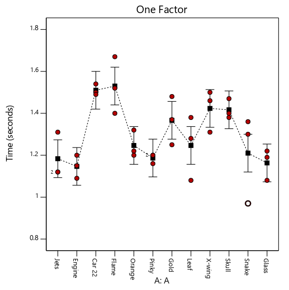 Being overwhelmed with data, I sampled out 12 cars from the dozens that Archer has tested thus far and typed the results into Design-Expert® software’s tools for this one-factor (categorical) comparative experiment. They came out highly significant with very clear divisions between the slowest and fastest cars. (Full disclosure—Archer did not fully randomize the trials, another thing for me to teach as he matures, but I will wait a year or two to try.)